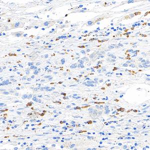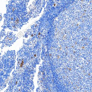 | IHC检测MMP9蛋白(货号 GB150076). 样品: 人扁桃体, 4%多聚甲醛 (货号G1101) 固定12-24小时. 抗原修复: Tris-EDTA抗原修复液(pH 9.0) (G1203), 100℃, 25分钟. —抗: 1: 1000稀释, 4℃ 孵育过夜. 二抗: S-vision免疫组化多聚二抗(山羊抗兔),即用型 (货号G1302), 室温孵育20分钟. |