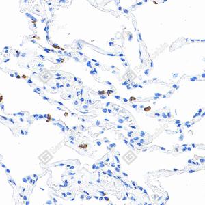 | IHC检测MMP9蛋白(货号 GB150076). 样品: 人肺, 4%多聚甲醛 (货号G1101) 固定12-24小时. 抗原修复: Tris-EDTA抗原修复液(pH 9.0) (G1203), 100℃, 25分钟. —抗: 1: 1000稀释, 4℃ 孵育过夜. 二抗: S-vision免疫组化多聚二抗(山羊抗兔),即用型 (货号G1302), 室温孵育20分钟. |
