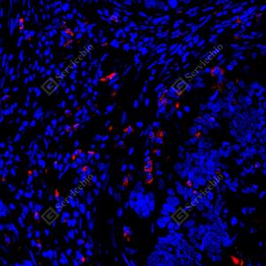 | IF检测MMP9蛋白(货号 GB150076)(红色). 样品: 人食管腺癌, 4%多聚甲醛 (货号G1101) 固定12-24小时. 抗原修复: Tris-EDTA抗原修复液(pH 9.0) (G1203), 100℃, 25分钟. 封闭: 3% BSA(货号GC305010)的PBS溶液, 室温孵育30分钟. —抗: 1: 1000稀释, 4℃ 孵育过夜. 二抗: Cy3标记山羊抗兔IgG (H+L) (货号GB21303), 1: 300稀释, 室温孵育1小时. |