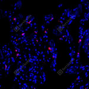 | IF检测MMP9蛋白(货号 GB150076)(红色). 样品: 人肺, 4%多聚甲醛 (货号G1101) 固定12-24小时. 抗原修复: Tris-EDTA抗原修复液(pH 9.0) (G1203), 100℃, 25分钟. 封闭: 3% BSA(货号GC305010)的PBS溶液, 室温孵育30分钟. —抗: 1: 1000稀释, 4℃ 孵育过夜. 二抗: Cy3标记山羊抗兔IgG (H+L) (货号GB21303), 1: 300稀释, 室温孵育1小时. |