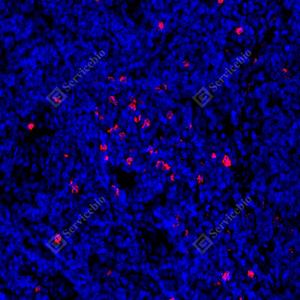 | IF检测MMP9蛋白(货号 GB150076)(红色). 样品: 人扁桃体, 4%多聚甲醛 (货号G1101) 固定12-24小时. 抗原修复: Tris-EDTA抗原修复液(pH 9.0) (G1203), 100℃, 25分钟. 封闭: 3% BSA(货号GC305010)的PBS溶液, 室温孵育30分钟. —抗: 1: 1000稀释, 4℃ 孵育过夜. 二抗: Cy3标记山羊抗兔IgG (H+L) (货号GB21303), 1: 300稀释, 室温孵育1小时. |