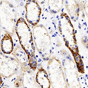 IHC检测MMP9蛋白(货号 GB11132-2). 样品: 人肾, 4%多聚甲醛 (货号G1101) 固定12-24小时. 抗原修复: 柠檬酸抗原修复液(干粉, pH 6.0) (G1201), 98℃, 20分钟. —抗: 1: 500稀释, 4℃ 孵育过夜. 二抗: HRP标记山羊抗兔IgG (H+L) (货号GB23303), 1: 200稀释, 室温孵育1小时. |
