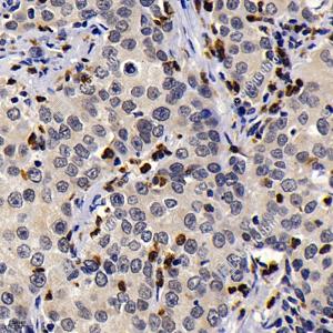 IHC检测MMP9蛋白(货号 GB11132-2). 样品: 人肺癌, 4%多聚甲醛 (货号G1101) 固定12-24小时. 抗原修复: 柠檬酸抗原修复液(干粉, pH 6.0) (G1201), 98℃, 20分钟. —抗: 1: 1000稀释, 4℃ 孵育过夜. 二抗: HRP标记山羊抗兔IgG (H+L) (货号GB23303), 1: 200稀释, 室温孵育1小时. |