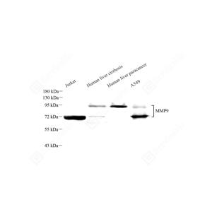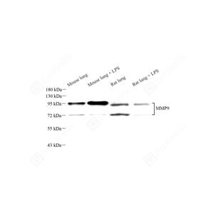 WB检测MMP9蛋白(货号 GB12132-1). 样品: 经RIPA裂解液(货号G2002)处理的蛋白质. 封闭: 封闭: 3%脱脂牛奶(货号GC310001)溶于TBST溶液, 室温孵育1小时. —抗: 1: 1000稀释, 4℃ 孵育过夜. 二抗: HRP标记山羊抗小鼠IgG (H+L) (货号GB23301), 1: 5000稀释, 室温孵育1小时. |
