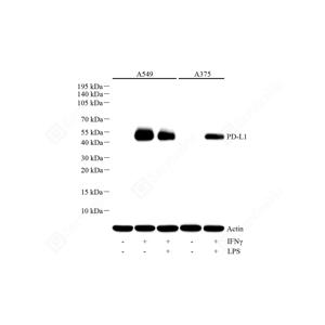 WB检测PD-L1蛋白(货号 GB155736). 样品: 经RIPA裂解液(货号G2002)处理的蛋白质. 封闭: 3%脱脂牛奶(货号GC310001)溶于TBST溶液, 室温孵育1小时. —抗: 1: 1000稀释, 4℃ 孵育过夜. 二抗: HRP标记山羊抗兔IgG (H+L) (货号GB23303), 1: 5000稀释, 室温孵育1小时. |