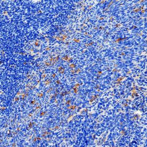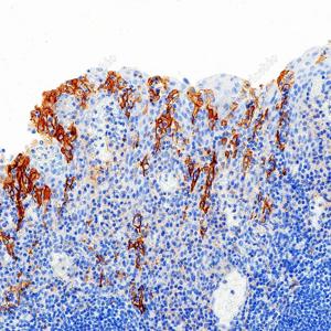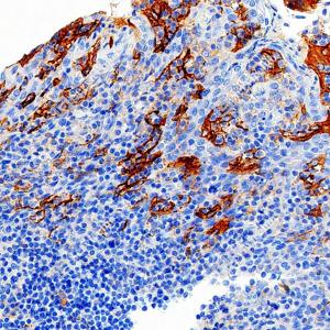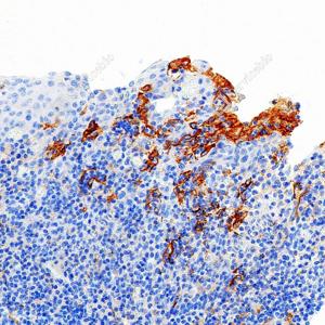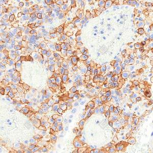 IHC检测PD-L1蛋白(货号 GB155736). 样品: 人扁桃体, 4%多聚甲醛 (货号G1101) 固定12-24小时. 抗原修复: Tris-EDTA抗原修复液(pH 9.0) (G1203), 98℃, 20分钟. —抗: 1: 200稀释, 4℃ 孵育过夜. 二抗: S-vision免疫组化多聚二抗(山羊抗兔),即用型 (货号G1302), 室温孵育20分钟. |