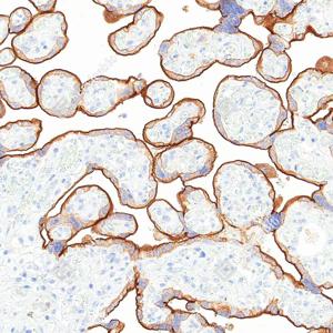 IHC检测PD-L1蛋白(货号 GB155736). 样品: 人胎盘, 4%多聚甲醛 (货号G1101) 固定12-24小时. 抗原修复: Tris-EDTA抗原修复液(pH 9.0) (G1203), 98℃, 20分钟. —抗: 1: 200稀释, 4℃ 孵育过夜. 二抗: S-vision免疫组化多聚二抗(山羊抗兔),即用型 (货号G1302), 室温孵育20分钟. |
