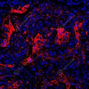 IF检测PD-L1蛋白(货号 GB155736)(红色). 样品: 人肺癌, 4%多聚甲醛 (货号G1101) 固定12-24小时. 抗原修复: Tris-EDTA抗原修复液(pH 9.0) (货号G1203), 高压锅均匀喷气计时2分钟. 封闭: 3% BSA(货号GC305010)的PBS溶液, 室温孵育30分钟. —抗: 1: 200稀释, 4℃ 孵育过夜. 二抗: Cy3标记山羊抗兔IgG (H+L) (货号GB21303), 1: 300稀释, 室温孵育1小时. |