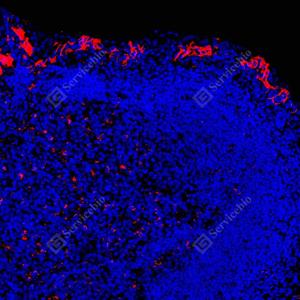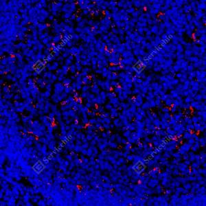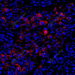 IF检测PD-L1蛋白(货号 GB155736)(红色). 样品: 人扁桃体, 4%多聚甲醛 (货号G1101) 固定12-24小时. 抗原修复: Tris-EDTA抗原修复液(pH 9.0) (货号G1203), 高压锅均匀喷气计时2分钟. 封闭: 3% BSA(货号GC305010)的PBS溶液, 室温孵育30分钟. —抗: 1: 200稀释, 4℃ 孵育过夜. 二抗: Cy3标记山羊抗兔IgG (H+L) (货号GB21303), 1: 300稀释, 室温孵育1小时. |