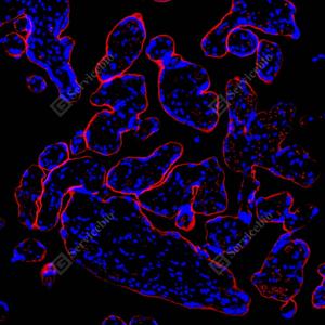 IF检测PD-L1蛋白(货号 GB155736)(红色). 样品: 人胎盘, 4%多聚甲醛 (货号G1101) 固定12-24小时. 抗原修复: Tris-EDTA抗原修复液(pH 9.0) (货号G1203), 高压锅均匀喷气计时2分钟. 封闭: 3% BSA(货号GC305010)的PBS溶液, 室温孵育30分钟. —抗: 1: 200稀释, 4℃ 孵育过夜. 二抗: Cy3标记山羊抗兔IgG (H+L) (货号GB21303), 1: 300稀释, 室温孵育1小时. |