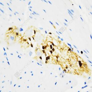 IHC检测S100 beta蛋白(货号 GB15360). 样品: 人神经节, 4%多聚甲醛 (货号G1101) 固定12-24小时. 抗原修复: Tris-EDTA抗原修复液(pH 9.0) (G1203), 98℃, 20分钟. —抗: 1: 1000稀释, 4℃ 孵育过夜. 二抗: HRP标记山羊抗小鼠IgG (H+L) (货号GB23301), 1: 200稀释, 室温孵育1小时. |
