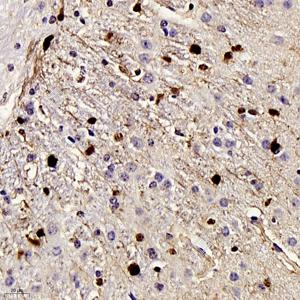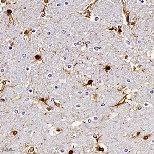 IHC检测S100 beta蛋白(货号 GB11359). 样品: 大鼠脑, 4%多聚甲醛 (货号G1101) 固定12-24小时. 抗原修复: 柠檬酸抗原修复液(干粉, pH 6.0) (G1201), 98℃, 20分钟. —抗: 1: 2000稀释, 4℃ 孵育过夜. 二抗: HRP标记山羊抗兔IgG (H+L) (货号GB23303), 1: 200稀释, 室温孵育1小时. |