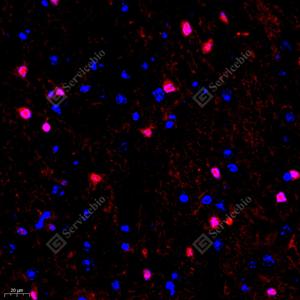 IF检测S100 beta蛋白(货号 GB11359)(红色). 样品: 小鼠脑, 4%多聚甲醛 (货号G1101) 固定12-24小时. 抗原修复: Tris-EDTA抗原修复液(pH 9.0) (G1203), 98℃, 20分钟. 封闭: 3% BSA(货号GC305010)的PBS溶液, 室温孵育30分钟. —抗: 1: 2000稀释, 4℃ 孵育过夜. 二抗: Cy3标记山羊抗兔IgG (H+L) (货号GB21303), 1: 300稀释, 室温孵育1小时. |