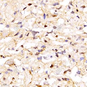 IHC检测S100 beta蛋白(货号 GB12359). 样品: 人神经胶质瘤, 4%多聚甲醛 (货号G1101) 固定12-24小时. 抗原修复: 柠檬酸抗原修复液(干粉, pH 6.0) (G1201), 98℃, 20分钟. —抗: 1: 1000稀释, 4℃ 孵育过夜. 二抗: HRP标记山羊抗小鼠IgG (H+L) (货号GB23301), 1: 200稀释, 室温孵育1小时. |