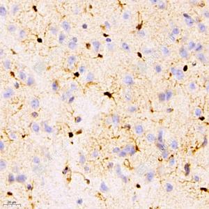 IHC检测S100 beta蛋白(货号 GB12359). 样品: 小鼠脑, 4%多聚甲醛 (货号G1101) 固定12-24小时. 抗原修复: 柠檬酸抗原修复液(干粉, pH 6.0) (G1201), 98℃, 20分钟. —抗: 1: 1000稀释, 4℃ 孵育过夜. 二抗: HRP标记山羊抗小鼠IgG (H+L) (货号GB23301), 1: 200稀释, 室温孵育1小时. |