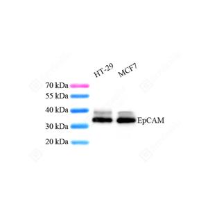 | WB检测EpCAM蛋白(货号 GB150034). 样品: 经RIPA裂解液(货号G2002)处理的蛋白质. 封闭: 3%脱脂牛奶(货号GC310001)溶于TBST溶液, 室温孵育1小时. —抗: 1: 1000稀释, 4℃ 孵育过夜. 二抗: HRP标记山羊抗兔IgG (H+L) (货号GB23303), 1: 5000稀释, 室温孵育1小时. |