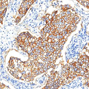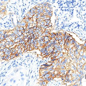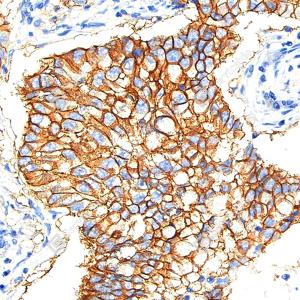 | IHC检测EpCAM蛋白(货号 GB150034). 样品: 人乳腺癌, 4%多聚甲醛 (货号G1101) 固定12-24小时. 抗原修复: 柠檬酸抗原修复液(干粉, pH 6.0) (G1201), 高压锅均匀喷气计时2分钟. —抗: 1: 1000稀释, 4℃ 孵育过夜. 二抗: S-vision免疫组化多聚二抗(山羊抗兔),即用型 (货号G1302), 室温孵育20分钟. |