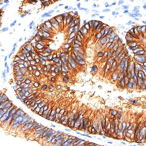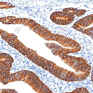 | IHC检测EpCAM蛋白(货号 GB150034). 样品: 人结肠癌, 4%多聚甲醛 (货号G1101) 固定12-24小时. 抗原修复: 柠檬酸抗原修复液(干粉, pH 6.0) (G1201), 高压锅均匀喷气计时2分钟. —抗: 1: 1000稀释, 4℃ 孵育过夜. 二抗: S-vision免疫组化多聚二抗(山羊抗兔),即用型 (货号G1302), 室温孵育20分钟. |