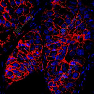 | IF检测EpCAM蛋白(货号 GB150034)(红色). 样品: 人肺癌, 4%多聚甲醛 (货号G1101) 固定12-24小时. 抗原修复: 柠檬酸抗原修复液(干粉, pH 6.0) (G1201), 高压锅均匀喷气计时2分钟. 封闭: 3% BSA(货号GC305010)的PBS溶液, 室温孵育30分钟. —抗: 1: 1000稀释, 4℃ 孵育过夜. 二抗: Cy3标记山羊抗兔IgG (H+L) (货号GB21303), 1: 300稀释, 室温孵育1小时. |