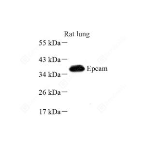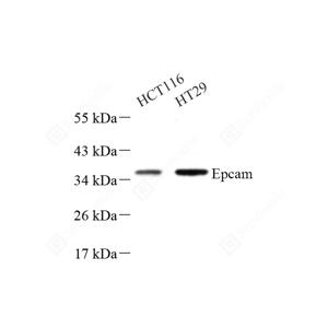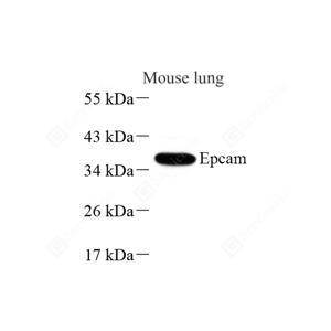 WB检测EpCAM蛋白(货号 GB11274). 样品: 经RIPA裂解液(货号G2002)处理的蛋白质. 封闭: 3%脱脂牛奶(货号GC310001)溶于TBST溶液, 室温孵育1小时. —抗: 1: 1000稀释, 4℃ 孵育过夜. 二抗: HRP标记山羊抗兔IgG (H+L) (货号GB23303), 1: 5000稀释, 室温孵育1小时. |