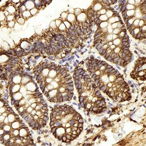 IHC检测EpCAM蛋白(货号 GB11274). 样品: 小鼠结肠, 4%多聚甲醛 (货号G1101) 固定12-24小时. 抗原修复: 柠檬酸抗原修复液(干粉, pH 6.0) (G1201), 98℃, 20分钟. —抗: 1: 1000稀释, 4℃ 孵育过夜. 二抗: HRP标记山羊抗兔IgG (H+L) (货号GB23303), 1: 200稀释, 室温孵育1小时. |