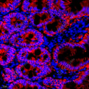 IF检测EpCAM蛋白(货号 GB11274)(红色). 样品: 小鼠结肠, 4%多聚甲醛 (货号G1101) 固定12-24小时. 抗原修复: Tris-EDTA抗原修复液(pH 9.0) (G1203), 98℃, 20分钟. 封闭: 3% BSA(货号GC305010)的PBS溶液, 室温孵育30分钟. —抗: 1: 500稀释, 4℃ 孵育过夜. 二抗: Cy3标记山羊抗兔IgG (H+L) (货号GB21303), 1: 300稀释, 室温孵育1小时. |