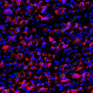IF检测EpCAM蛋白(货号 GB11274)(红色). 样品: 小鼠肾, 4%多聚甲醛 (货号G1101) 固定12-24小时. 抗原修复: Tris-EDTA抗原修复液(pH 9.0) (G1203), 98℃, 20分钟. 封闭: 3% BSA(货号GC305010)的PBS溶液, 室温孵育30分钟. —抗: 1: 500稀释, 4℃ 孵育过夜. 二抗: Cy3标记山羊抗兔IgG (H+L) (货号GB21303), 1: 300稀释, 室温孵育1小时. |