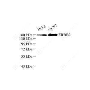 | WB检测ErbB2/HER2蛋白(货号 GB11327). 样品: 经RIPA裂解液(货号G2002)处理的蛋白质. 封闭: 封闭: 3%脱脂牛奶(货号GC310001)溶于TBST溶液, 室温孵育1小时. —抗: 1: 500稀释, 4℃ 孵育过夜. 二抗: HRP标记山羊抗兔IgG (H+L) (货号GB23303), 1: 5000稀释, 室温孵育1小时. |