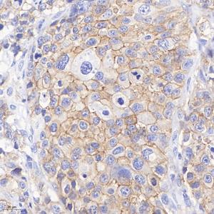 | IHC检测ErbB2/HER2蛋白(货号 GB12327). 样品: 人膀胱癌, 4%多聚甲醛 (货号G1101) 固定12-24小时. 抗原修复: 柠檬酸抗原修复液(干粉, pH 6.0) (G1201), 高压锅均匀喷气计时2分钟. —抗: 1: 1000稀释, 4℃ 孵育过夜. 二抗: HRP标记山羊抗小鼠IgG (H+L) (货号GB23301), 1: 200稀释, 室温孵育1小时. |