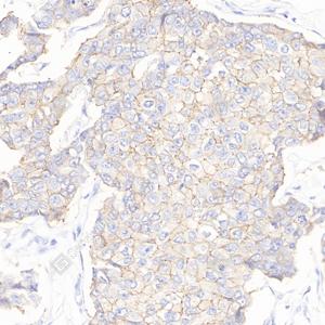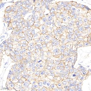 | IHC检测ErbB2/HER2蛋白(货号 GB12327). 样品: 人乳腺癌, 4%多聚甲醛 (货号G1101) 固定12-24小时. 抗原修复: 柠檬酸抗原修复液(干粉, pH 6.0) (G1201), 高压锅均匀喷气计时2分钟. —抗: 1: 800稀释, 4℃ 孵育过夜. 二抗: HRP标记山羊抗小鼠IgG (H+L) (货号GB23301), 1: 200稀释, 室温孵育1小时. |