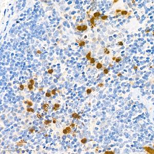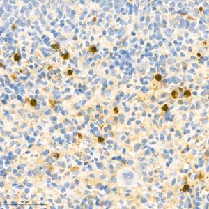 IHC检测S100A9蛋白(货号 GB111149). 样品: 小鼠脾, 4%多聚甲醛 (货号G1101) 固定12-24小时. 抗原修复: 柠檬酸抗原修复液(干粉, pH 6.0) (G1201), 98℃, 20分钟. —抗: 1: 1800稀释, 4℃ 孵育过夜. 二抗: HRP标记山羊抗兔IgG (H+L) (货号GB23303), 1: 200稀释, 室温孵育1小时. |