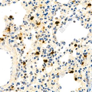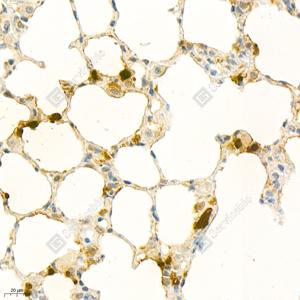 IHC检测S100A9蛋白(货号 GB111149). 样品: 小鼠肺, 4%多聚甲醛 (货号G1101) 固定12-24小时. 抗原修复: 柠檬酸抗原修复液(干粉, pH 6.0) (G1201), 98℃, 20分钟. —抗: 1: 1800稀释, 4℃ 孵育过夜. 二抗: HRP标记山羊抗兔IgG (H+L) (货号GB23303), 1: 200稀释, 室温孵育1小时. |