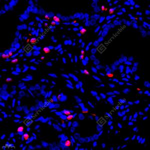 IF检测S100A9蛋白(货号 GB111149)(红色). 样品: 小鼠肺, 4%多聚甲醛 (货号G1101) 固定12-24小时. 抗原修复: Tris-EDTA抗原修复液(pH 9.0) (G1203), 98℃, 20分钟. 封闭: 3% BSA(货号GC305010)的PBS溶液, 室温孵育30分钟. —抗: 1: 900稀释, 4℃ 孵育过夜. 二抗: Cy3标记山羊抗兔IgG (H+L) (货号GB21303), 1: 300稀释, 室温孵育1小时. |