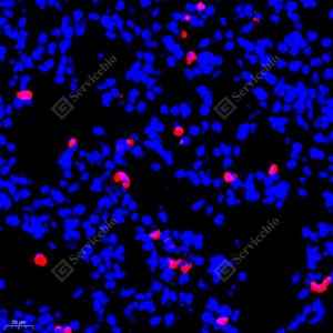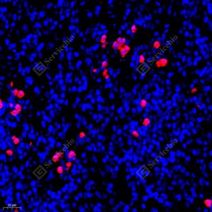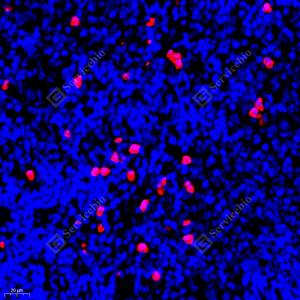 IF检测S100A9蛋白(货号 GB111149)(红色). 样品: 小鼠脾, 4%多聚甲醛 (货号G1101) 固定12-24小时. 抗原修复: Tris-EDTA抗原修复液(pH 9.0) (G1203), 98℃, 20分钟. 封闭: 3% BSA(货号GC305010)的PBS溶液, 室温孵育30分钟. —抗: 1: 900稀释, 4℃ 孵育过夜. 二抗: Cy3标记山羊抗兔IgG (H+L) (货号GB21303), 1: 300稀释, 室温孵育1小时. |