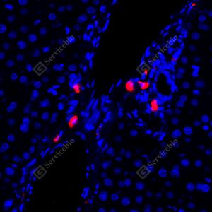 IF检测Granzyme B蛋白(货号 GB12093)(红色). 样品: 大鼠肝, 4%多聚甲醛 (货号G1101) 固定12-24小时. 抗原修复: 柠檬酸抗原修复液(干粉, pH 6.0) (G1201), 高压锅均匀喷气计时2分钟. 封闭: 3% BSA(货号GC305010)的PBS溶液, 室温孵育30分钟. —抗: 1: 300稀释, 4℃ 孵育过夜. 二抗: Cy3标记山羊抗小鼠IgG (H+L) (货号GB21301), 1: 300稀释, 室温孵育1小时. |