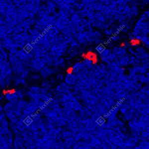 IF检测Granzyme B蛋白(货号 GB12093)(红色). 样品: 大鼠胸腺, 4%多聚甲醛 (货号G1101) 固定12-24小时. 抗原修复: 柠檬酸抗原修复液(干粉, pH 6.0) (G1201), 高压锅均匀喷气计时2分钟. 封闭: 3% BSA(货号GC305010)的PBS溶液, 室温孵育30分钟. —抗: 1: 300稀释, 4℃ 孵育过夜. 二抗: Cy3标记山羊抗小鼠IgG (H+L) (货号GB21301), 1: 300稀释, 室温孵育1小时. |
