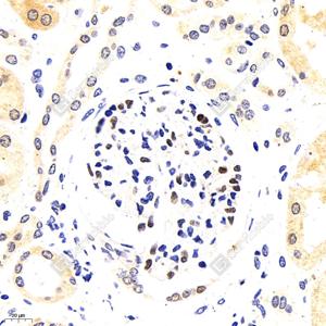 | IHC检测Wilms Tumor Protein蛋白(货号 GB11382). 样品: 人肾, 4%多聚甲醛 (货号G1101) 固定12-24小时. 抗原修复: 柠檬酸抗原修复液(干粉, pH 6.0) (G1201), 98℃, 20分钟. —抗: 1: 200稀释, 4℃ 孵育过夜. 二抗: HRP标记山羊抗兔IgG (H+L) (货号GB23303), 1: 200稀释, 室温孵育1小时. |
