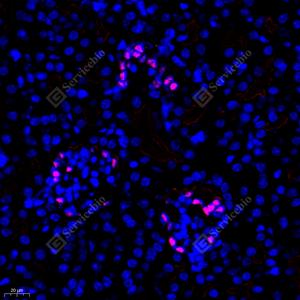 | IF检测Wilms Tumor Protein蛋白(货号 GB11382)(红色). 样品: 小鼠肾, 4%多聚甲醛 (货号G1101) 固定12-24小时. 抗原修复: Tris-EDTA抗原修复液(pH 9.0) (G1203), 98℃, 20分钟. 封闭: 3% BSA(货号GC305010)的PBS溶液, 室温孵育30分钟. —抗: 1: 100稀释, 4℃ 孵育过夜. 二抗: Cy3标记山羊抗兔IgG (H+L) (货号GB21303), 1: 300稀释, 室温孵育1小时. |