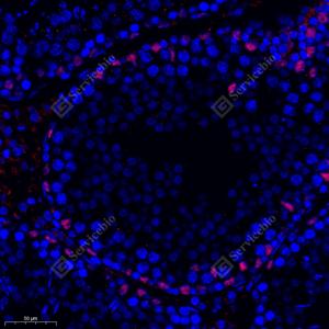 | IF检测Wilms Tumor Protein蛋白(货号 GB11382)(红色). 样品: 大鼠睾丸, 4%多聚甲醛 (货号G1101) 固定12-24小时. 抗原修复: Tris-EDTA抗原修复液(pH 9.0) (G1203), 98℃, 20分钟. 封闭: 3% BSA(货号GC305010)的PBS溶液, 室温孵育30分钟. —抗: 1: 100稀释, 4℃ 孵育过夜. 二抗: Cy3标记山羊抗兔IgG (H+L) (货号GB21303), 1: 300稀释, 室温孵育1小时. |