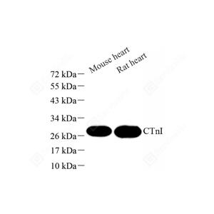 WB检测Cardiac Troponin I蛋白(货号 GB11393). 样品: 经RIPA裂解液(货号G2002)处理的蛋白质. 封闭: 封闭: 3%脱脂牛奶(货号GC310001)溶于TBST溶液, 室温孵育1小时. —抗: 1: 500稀释, 4℃ 孵育过夜. 二抗: HRP标记山羊抗兔IgG (H+L) (货号GB23303), 1: 5000稀释, 室温孵育1小时. |