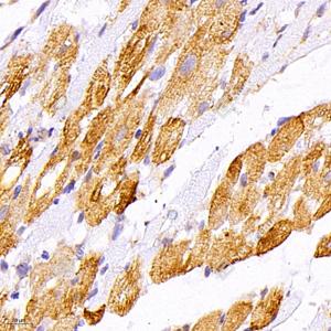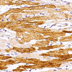 IHC检测Cardiac Troponin I蛋白(货号 GB112408). 样品: 大鼠心, 4%多聚甲醛 (货号G1101) 固定12-24小时. 抗原修复: 柠檬酸抗原修复液(干粉, pH 6.0) (G1201), 98℃, 20分钟. —抗: 1: 200稀释, 4℃ 孵育过夜. 二抗: HRP标记山羊抗兔IgG (H+L) (货号GB23303), 1: 200稀释, 室温孵育1小时. |