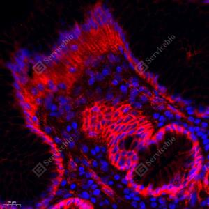 IF检测Carbonic Anhydrase 9/CA9蛋白(货号 GB113899)(红色). 样品: 人胃, 4%多聚甲醛 (货号G1101) 固定12-24小时. 抗原修复: Tris-EDTA抗原修复液(pH 9.0) (G1203), 98℃, 20分钟. 封闭: 3% BSA(货号GC305010)的PBS溶液, 室温孵育30分钟. —抗: 1: 1500稀释, 4℃ 孵育过夜. 二抗: Cy3标记山羊抗兔IgG (H+L) (货号GB21303), 1: 300稀释, 室温孵育1小时. |
