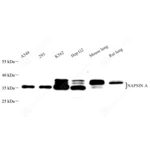 WB检测NAPSIN A蛋白(货号 GB121010). 样品: 经RIPA裂解液(货号G2002)处理的蛋白质. 封闭: 封闭: 3%脱脂牛奶(货号GC310001)溶于TBST溶液, 室温孵育1小时. —抗: 1: 1000稀释, 4℃ 孵育过夜. 二抗: HRP标记山羊抗小鼠IgG (H+L) (货号GB23301), 1: 5000稀释, 室温孵育1小时. |