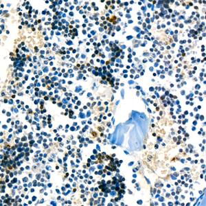 IHC检测LOXL2蛋白(货号 GB111322). 样品: 小鼠睾丸, 4%多聚甲醛 (货号G1101) 固定12-24小时. 抗原修复: 柠檬酸抗原修复液(干粉, pH 6.0) (G1201), 98℃, 20分钟. —抗: 1: 250稀释, 4℃ 孵育过夜. 二抗: HRP标记山羊抗兔IgG (H+L) (货号GB23303), 1: 200稀释, 室温孵育1小时. |