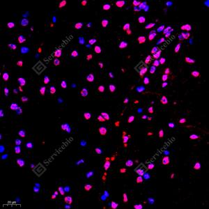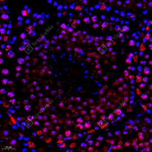IF检测LOXL2蛋白(货号 GB111322)(红色). 样品: 小鼠睾丸, 4%多聚甲醛 (货号G1101) 固定12-24小时. 抗原修复: Tris-EDTA抗原修复液(pH 9.0) (G1203), 98℃, 20分钟. 封闭: 3% BSA(货号GC305010)的PBS溶液, 室温孵育30分钟. —抗: 1: 500稀释, 4℃ 孵育过夜. 二抗: Cy3标记山羊抗兔IgG (H+L) (货号GB21303), 1: 300稀释, 室温孵育1小时. |