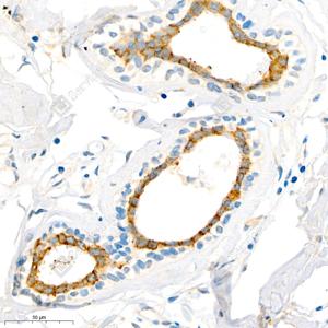 IHC检测Anterior Gradient 2蛋白(货号 GB111327). 样品: 人乳腺癌, 4%多聚甲醛 (货号G1101) 固定12-24小时. 抗原修复: 柠檬酸抗原修复液(干粉, pH 6.0) (G1201), 98℃, 20分钟. —抗: 1: 2000稀释, 4℃ 孵育过夜. 二抗: HRP标记山羊抗兔IgG (H+L) (货号GB23303), 1: 200稀释, 室温孵育1小时. |