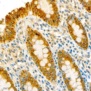 IHC检测Anterior Gradient 2蛋白(货号 GB111327). 样品: 大鼠小肠, 4%多聚甲醛 (货号G1101) 固定12-24小时. 抗原修复: 柠檬酸抗原修复液(干粉, pH 6.0) (G1201), 98℃, 20分钟. —抗: 1: 2000稀释, 4℃ 孵育过夜. 二抗: HRP标记山羊抗兔IgG (H+L) (货号GB23303), 1: 200稀释, 室温孵育1小时. |
