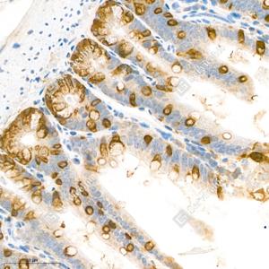 IHC检测Anterior Gradient 2蛋白(货号 GB111327). 样品: 小鼠小肠, 4%多聚甲醛 (货号G1101) 固定12-24小时. 抗原修复: 柠檬酸抗原修复液(干粉, pH 6.0) (G1201), 98℃, 20分钟. —抗: 1: 2000稀释, 4℃ 孵育过夜. 二抗: HRP标记山羊抗兔IgG (H+L) (货号GB23303), 1: 200稀释, 室温孵育1小时. |