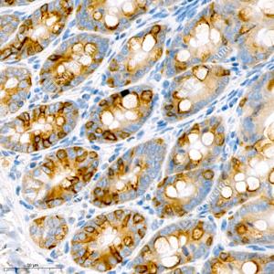 IHC检测Anterior Gradient 2蛋白(货号 GB111327). 样品: 人结肠, 4%多聚甲醛 (货号G1101) 固定12-24小时. 抗原修复: 柠檬酸抗原修复液(干粉, pH 6.0) (G1201), 98℃, 20分钟. —抗: 1: 2000稀释, 4℃ 孵育过夜. 二抗: HRP标记山羊抗兔IgG (H+L) (货号GB23303), 1: 200稀释, 室温孵育1小时. |
