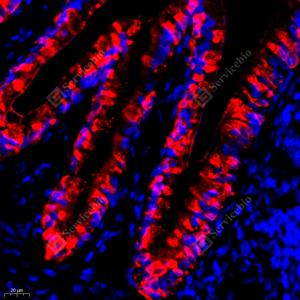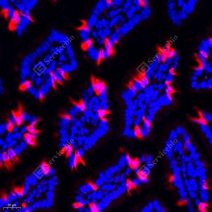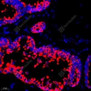 IF检测Anterior Gradient 2蛋白(货号 GB111327)(红色). 样品: 小鼠小肠, 4%多聚甲醛 (货号G1101) 固定12-24小时. 抗原修复: Tris-EDTA抗原修复液(pH 9.0) (G1203), 98℃, 20分钟. 封闭: 3% BSA(货号GC305010)的PBS溶液, 室温孵育30分钟. —抗: 1: 2000稀释, 4℃ 孵育过夜. 二抗: Cy3标记山羊抗兔IgG (H+L) (货号GB21303), 1: 300稀释, 室温孵育1小时. |